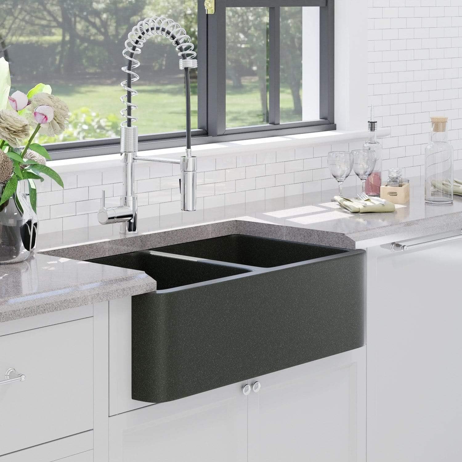 33 inch black granite farmhouse sink. This granite farmhouse sink is the perfect addition to any kitchen. Contemporary farmhouse style with an ultra-durable apron front. Free shipping on orders of 50 or more.